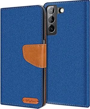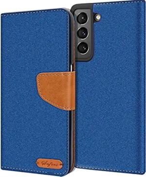 Handyhülle Stoff für Samsung Galaxy S21 FE Textil Wallet Case, Stoff-Design mit Magnetverschluss & Kartenfächern, kompatibel mit Samsung Galaxy S21 FE (6,4 Zoll), Blau