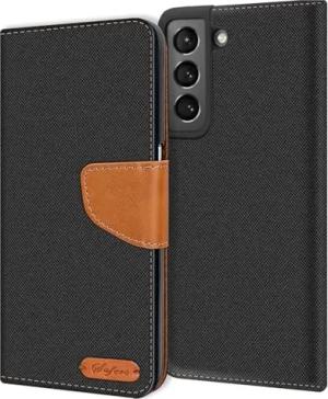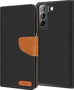 Handyhülle Stoff für Samsung Galaxy S21 FE Textil Wallet Case, Stoff-Design mit Magnetverschluss & Kartenfächern, kompatibel mit Samsung Galaxy S21 FE (6,4 Zoll), Schwarz