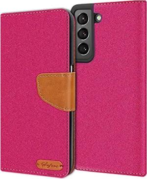 Handyhülle Stoff für Samsung Galaxy S21 Textil Wallet Case, Stoff-Design mit Magnetverschluss & Kartenfächern, kompatibel mit Samsung Galaxy S21 (6,2 Zoll), Pink