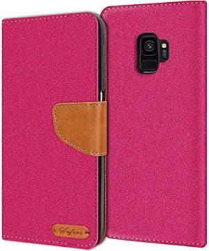 Handyhülle Stoff für Samsung Galaxy S9 Textil Wallet Case, Stoff-Design mit Magnetverschluss & Kartenfächern, kompatibel mit Samsung Galaxy S9 (5,8 Zoll), Pink