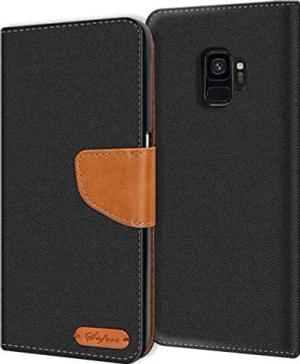 Handyhülle Stoff für Samsung Galaxy S9 Textil Wallet Case, Stoff-Design mit Magnetverschluss & Kartenfächern, kompatibel mit Samsung Galaxy S9 (5,8 Zoll), Schwarz