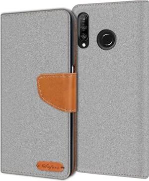 Textil Klapphülle für Huawei P30 Lite, Hochwertige Schutzhülle mit 3 Kartenfächern, 1 Bargeldfach und Magnetverschluss, Grau