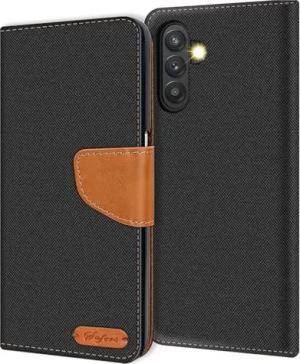 Handyhülle Stoff für Samsung Galaxy A25 5G Textil Wallet Case, Stoff-Design mit Magnetverschluss & Kartenfächern, kompatibel mit Samsung Galaxy A25 5G (6,5 Zoll), Schwarz