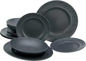33320, Serie Rondo SCHIEFER black, 12-teiliges Geschirrset, Teller Set aus Steinzeug, spülmaschinen- und mikrowellengeeignet, Made in Portugal