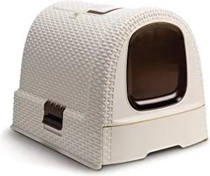 petlife Katzentoilette mit Deckel, Katzenklo inklusive Schaufel, moderne Rattangeflecht-Optik, weiß, 51,5 x 38,5 x 40 cm