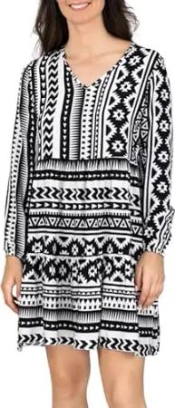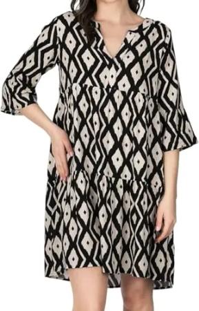 Sommerkleid Damen Knielang A Linie DFFrida 3/4 Ärmel Strandkleid Boho Tunika Kleid Sommer Midikleid Freizeitkleid 100% Viskose, Größe:L/XL, Farben:Black-Beige