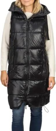 Steppweste Damen lang mit Kapuze Regular Fit DFCaro Weste Knielang Outdoor Reißverschluss Taschen Herbst Winter Schwarz S, Größe:S, Farbe:Black