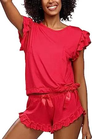 Damen Schlafanzug Set Lulu XXL - Zweiteiler Damen Pyjama - Loungewear mit Kurzen Ärmeln und Shorts - Nachtwäsche Damen mit Tasche und Rüschen - Pjama Set Kurz Rot