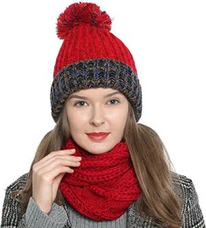 Damen Wintermütze Strickmütze gefüttert warm und weich mit Bommel rot-blau-beige