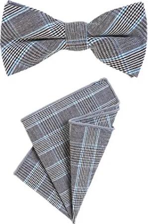 Herren Fliege 12 x 6 cm mit farblich passendem Einstecktuch 23 x 23 cm beides aus Baumwolle im Tweed Look grau-blau kariert