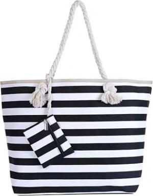 Strandtasche mit Reißverschluss, Große Strandtasche XXL, Shopper Tasche Damen - Praktische Beach bag Umhängetasche Damen Badetasche für Strand und Meer - gestreift schwarz weiß
