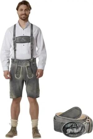 Echtleder Lederhose kurz, Trachtenlederhosen für Herren, Trachten Lederhose Vintage Look Lederhosen mit Hosenträgern, Latz und Trachtengürtel, Trachtenhose Herren - Sandfarben, 50