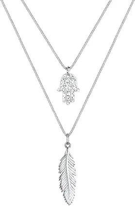 Halskette Silber 925 Layer Feder Hamsa Hand Anhänger Kette Damen Kristall Schmuck Geschenke für Frauen Mädchen Mama Freundin, Lagen Silberkette Länge 45 cm