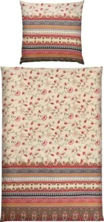 Mako-Satin Bettwäsche Blumen und Bordüre beige-rot Größe 80x80 cm / 135x200 cm - seidig weiche Qualität, temperaturausgleichend, mit Reißverschluss