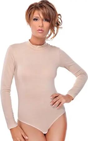 Damen Body Langarm | Stringbody aus Baumwolle-Elasthan mir Halbkragen | Langarmbody mit Verschluß-Haken | Blickdichter Bodysuit | Unterzieh-Body Beige XXL