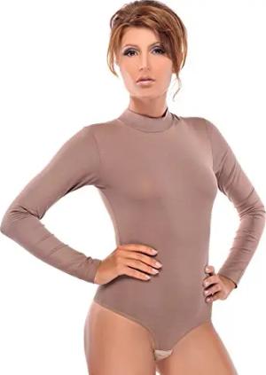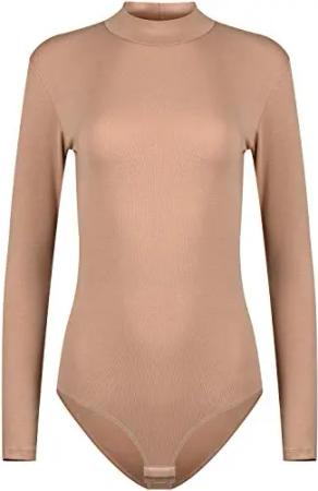Damen Body Langarm | Stringbody aus Baumwolle-Elasthan mir Halbkragen | Langarmbody mit Verschluß-Haken | Blickdichter Bodysuit | Unterzieh-Body Hellbraun XXL