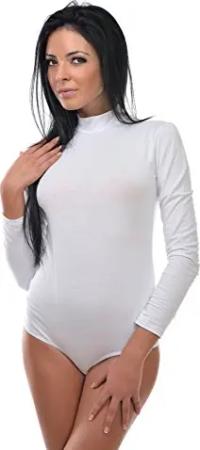 Damen Body Langarm | Stringbody aus Baumwolle-Elasthan mir Halbkragen | Langarmbody mit Verschluß-Haken | Blickdichter Bodysuit | Unterzieh-Body Weiß XL
