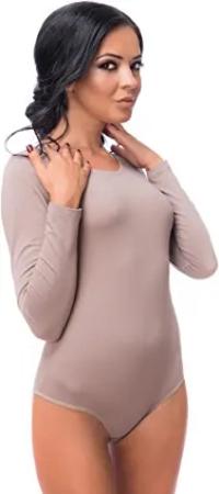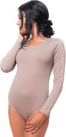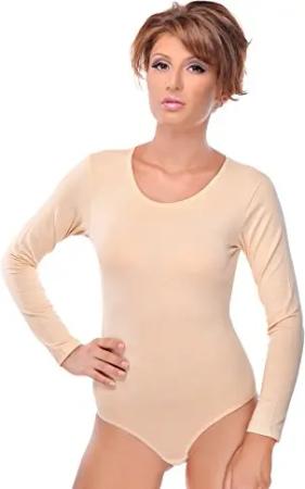Damen Body Langarm | Stringbody aus Baumwolle-Elasthan mir Rundhals | Langarmbody mit Verschluß-Haken | Blickdichter Bodysuit | Unterzieh-Body M hellbraun
