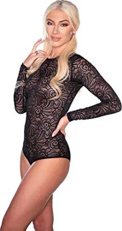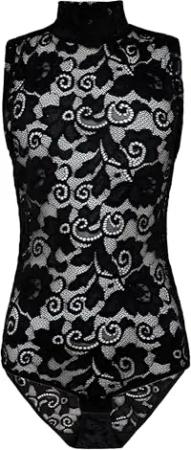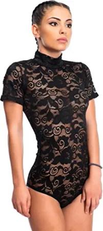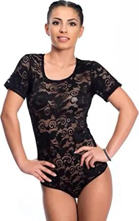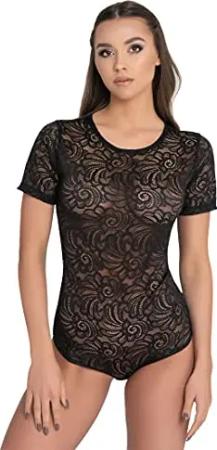 Damen Body transparent Kurzarmbody aus Spitze (L, Schwarz)