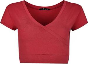 Damen T-Shirt mit V-Ausschnitt aus Baumwolle Kurzärmeliges Crop Top Atmungsakteves Oberteil T Shirt Bordeaux S