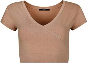 Damen T-Shirt mit V-Ausschnitt aus Baumwolle Kurzärmeliges Crop Top Atmungsakteves Oberteil T Shirt Hellbraun S