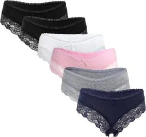 6er Damen Unterhosen aus bequemer Baumwolle - Frauen Hipster Panty mit sexy Spitze, Slip Unterwäsche Mehrpack, Schwarz, Weiß, Rosa, Grau, Blau Multifarb Set 38