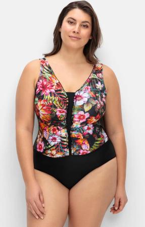 Große Größen: Badeanzug mit Blätterdruck und Shapingeffekt, schwarz gemustert, Gr.40B-52E