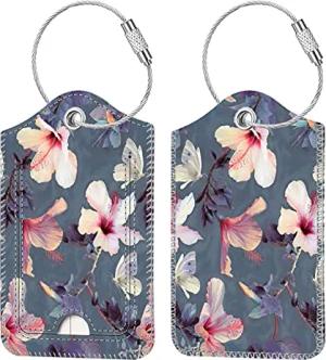 [2 Stück] Fintie Kofferanhänger mit Adressschild, Kunstleder Gepäckanhänger ID Etikett mit Edelstahl Drahtseil und Namenschild für Reisetasche Koffer, Blühender Hibiskus