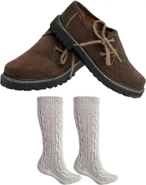Haferlschuhe, Trachtensocken & 2X Schnürsenkel Set - Trachtenschuhe aus Wildleder Original Handmachart 100% Leder Atmungsaktiv Kalbsleder-Futter Lederschuhe mit Socken Dunkelbraun - 45 EU