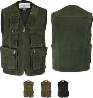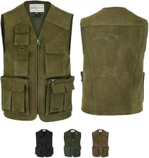 Herren Jagd Lederweste Jagdweste aus Nubuckleder - Freizeit 9-Taschen Angelweste - Outdoor Camping Multi-Taschen Angler Weste - Multifunktionsweste Tarnweste Jagdgrün - 48