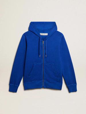 Blaue Kapuzensweatjacke Für Herren Mit Schriftzug Am Rücken, Mann, Größe: L