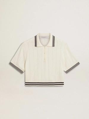 Cropped-polohemd Aus Baumwolle In Lived-in-white Mit Blauen Rippen, Frau, Größe: L