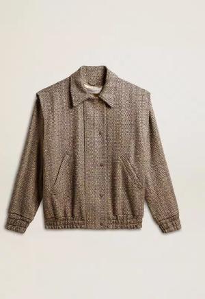 Damenbomberjacke Aus Wolle Mit Ekrü-braunem Fischgratmuster, Frau, Größe: 36
