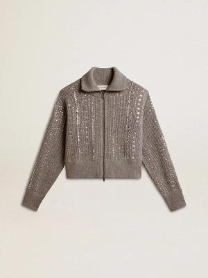 Grau Melierter Damenpullover In Cropped-länge Aus Wolle Mit Pailletten, , Größe: L