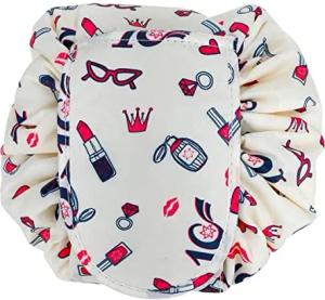 Kosmetiktasche in Creme Girly Motiv - 62 x 54 cm - Runder One Step Kulturbeutel mit Kordelzug zum Zusammenziehen mit 2 inneren Reißverschlussfächern zur Aufbewahrung von Make-Up etc.
