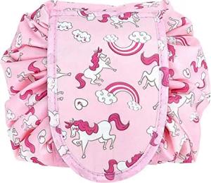 Kosmetiktasche in ROSA Weisse Pferde - 62 x 54 cm - Runder One Step Kulturbeutel mit Kordelzug zum Zusammenziehen mit 2 inneren Reißverschlussfächern zur Aufbewahrung von Make-Up etc.