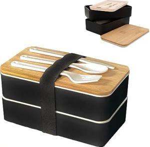 Lunch Box Bento Box mit 3 Fächern und Besteck in Schwarz - 18.5. x 10.5 x 9.3 cm - Brotdose für Erwachsene und Kinder für Schule und Arbeit sicher verschließbar mit Messer Gabel und Löffel