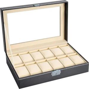 Uhrenschatulle mit 12 Steckplätzen Uhrenbox mit Glasdeckel in Schwarz - 30 x 20 x 8 cm - Präsentiervitrine zum Aufbewahren Transportieren und Vorführen von Uhren und Schmuck