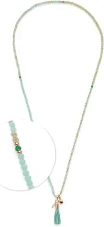 Halskette Donna • lange Endlos-Kette aus goldfarbenem Edelstahl • Glasperlen in sanften Türkistönen • Quasten-Anhänger • 80 cm Länge • Schmuck Geschenk für Frauen • 024896