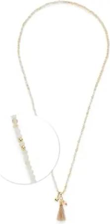 Halskette Donna • lange Endlos-Kette aus goldfarbenem Edelstahl • Glasperlenkette in sanften Beigetönen • Quasten-Anhänger • 80 cm Länge • Schmuck Geschenk für Frauen • 024897