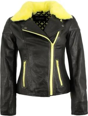 Damen Lederjacke Bikerjacke Lammnappa schwarz/gelb Größe 46