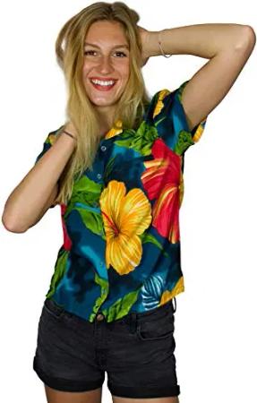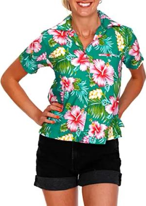 Funky Hawaii-Bluse-Hemd, Damen, Kurzarm, JK-Hibiscus-New, Petrol-Grün, XL