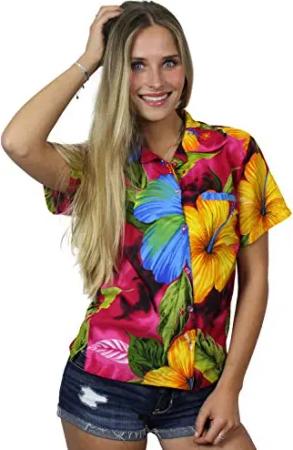 Funky Hawaii-Bluse-Hemd, Damen, Kurzarm, Big-Flower, Pink, XL