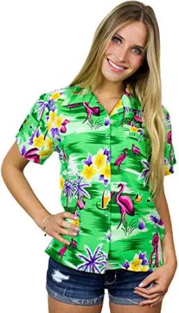 Funky Hawaii-Bluse-Hemd, Damen, Kurzarm, Flamingos, Loud-Grün, M