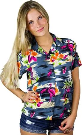 Funky Hawaii-Bluse-Hemd, Damen, Kurzarm, JK-Flamingo-Melon-Print, Blau, L