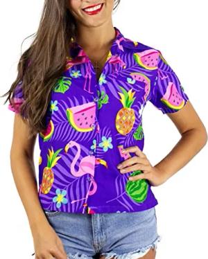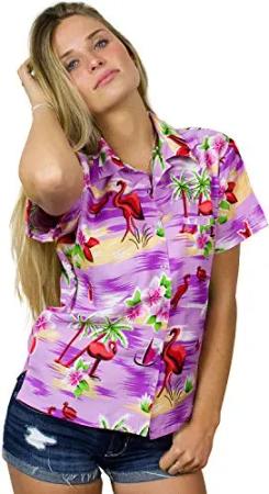 Funky Hawaii-Bluse-Hemd, Damen, Kurzarm, JK-Flamingo-Melon-Print, Violett, XL