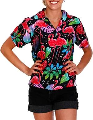 Funky Hawaii-Bluse-Hemd, Damen, Kurzarm, Flamingos, Schwarz, XS