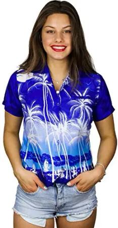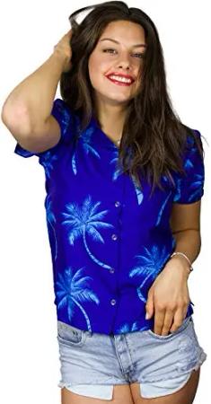 Funky Hawaii-Bluse-Hemd, Damen, Kurzarm, Beach, Mono-Blau, XS