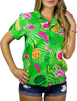 Funky Hawaii-Bluse-Hemd, Damen, Kurzarm, JK-Flamingo-Melon-Print, Grün, M