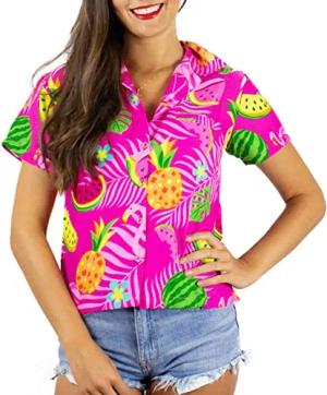 Funky Hawaii-Bluse-Hemd, Damen, Kurzarm, JK-Flamingo-Melon-Print, Pink, XXL